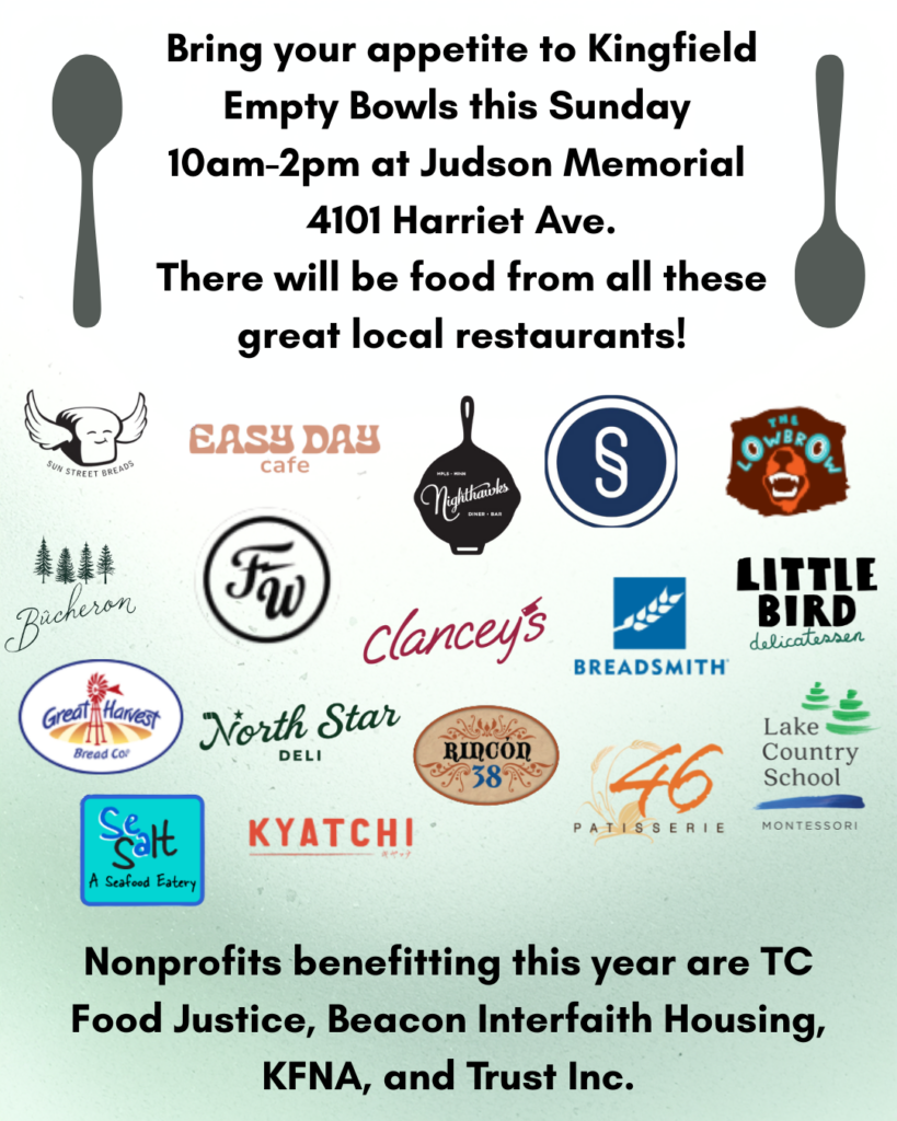 All proceeds from the event support TRUST Inc, delivering meals and giving support to elders in their homes, and Nicollet Square, a housing option for formerly homeless youth that offers apartments along with optional onsite mental health care and emotional support, and the Kingfield Neighborhood Association. Empty Bowls was created to strengthen our neighborhood by turning a simple meal into meaningful support for those who need it most.